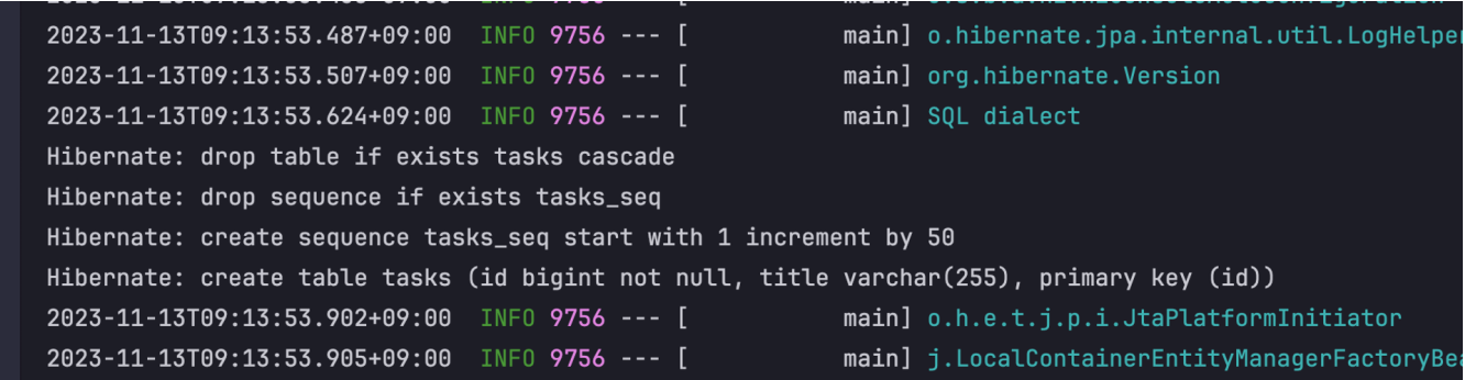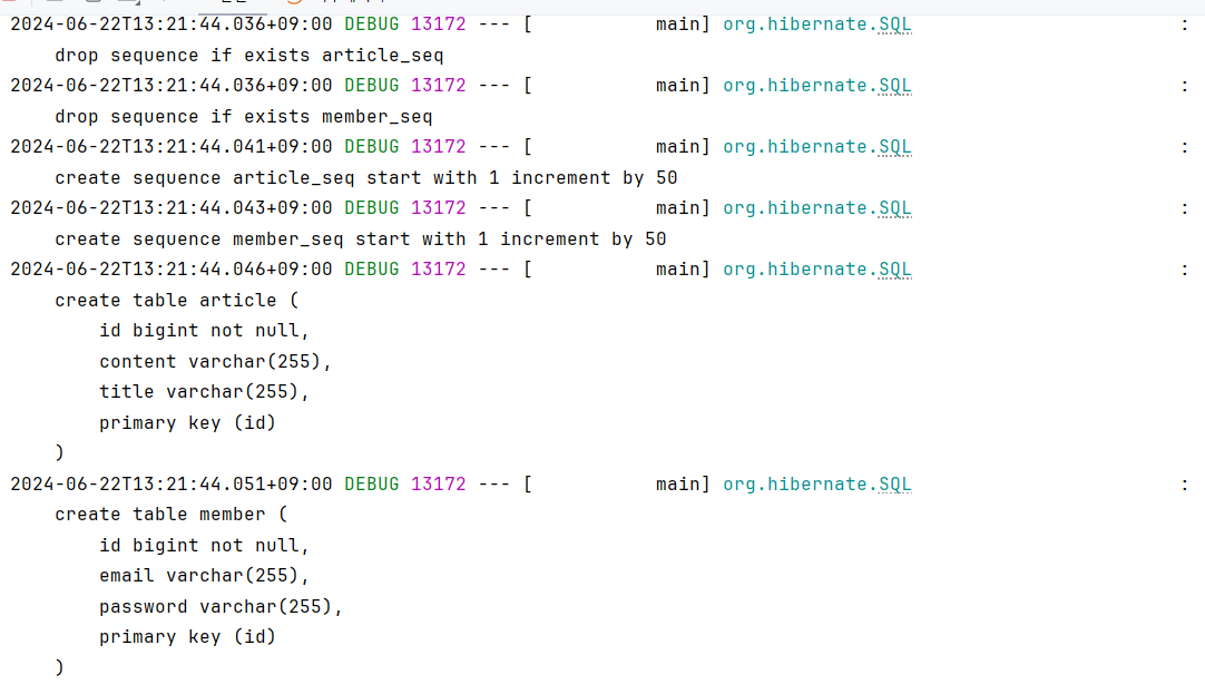- 디버그 모드로 바꾸면 DB 생성 과정이 보이고, 줄 바꿈을 켰음