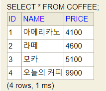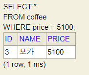 - 앞서 실습한 coffee 테이블에서 가격이 5,100원인 커피를 찾으려고 합니다. 이를 위한 쿼리를 작성해 보세요.