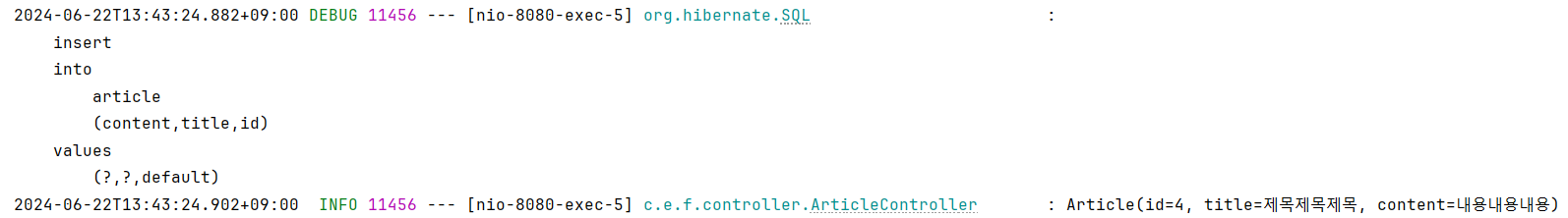 | 1 | INSERT INTO article(id, title, content) VALUES(4, '제목4', '내용4'); |