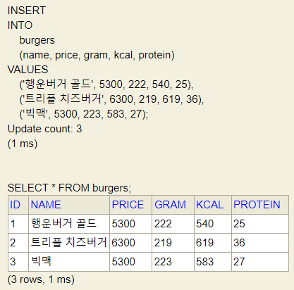 - bugers 테이블에서 데이터를 생성 및 조회해 다음과 같은 결과가 나오도록 SQL 쿼리를 작성하세요.