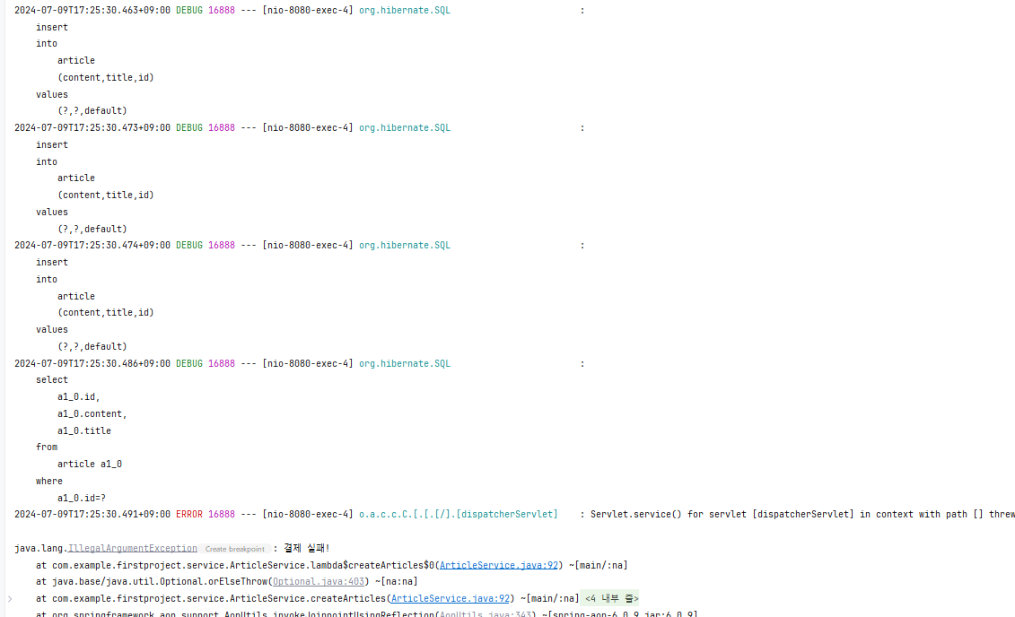 이렇듯 트랜잭션이 적용되고 아니고는 매우 중요합니다. 만약 트랜잭션이 적용되었다면 알수 없는 문제가 생겼을 때 롤백이 돼서 쓰레기 값이 DB에 저장되지 않았을 겁니다.