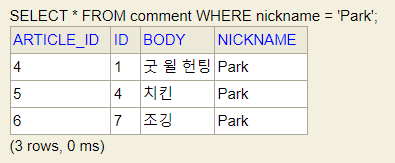 INSERT INTO comment(article_id, nickname, body) VALUES (5, 'Park', '치킨');