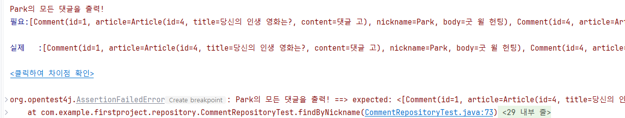 assertEquals(expected.toString(), comments.toString(), "Park의 모든 댓글을 출력!");