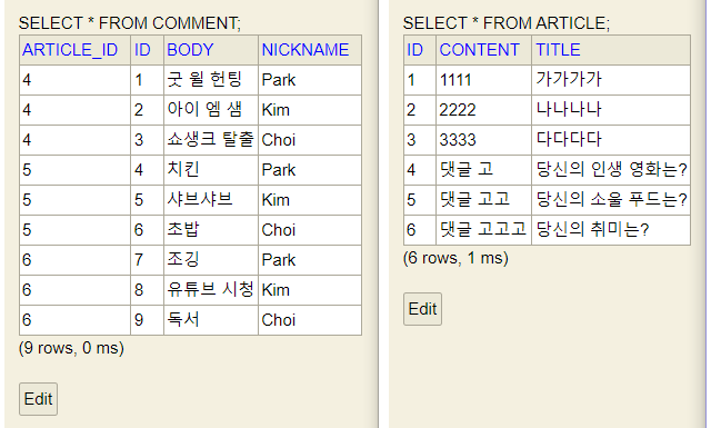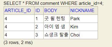 - comment 테이블의 외래키로 article 테이블의 대표키를 갖고 있음