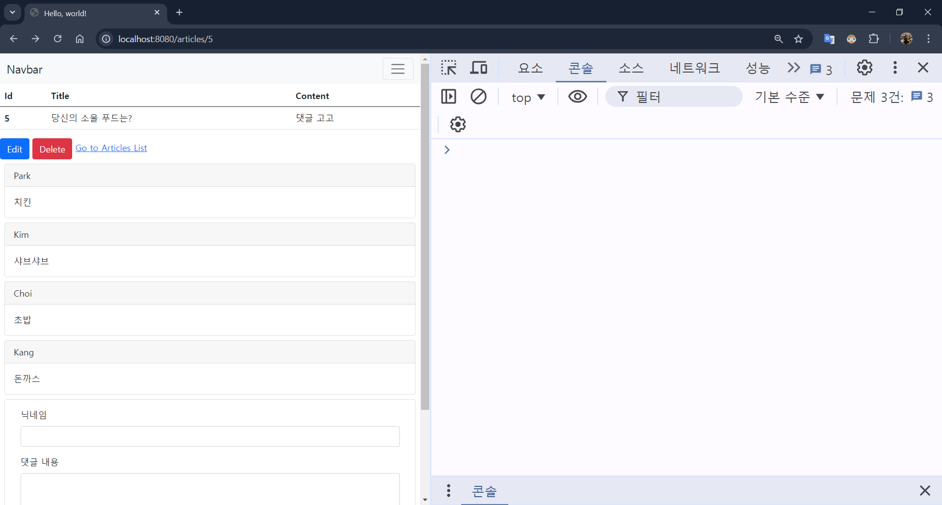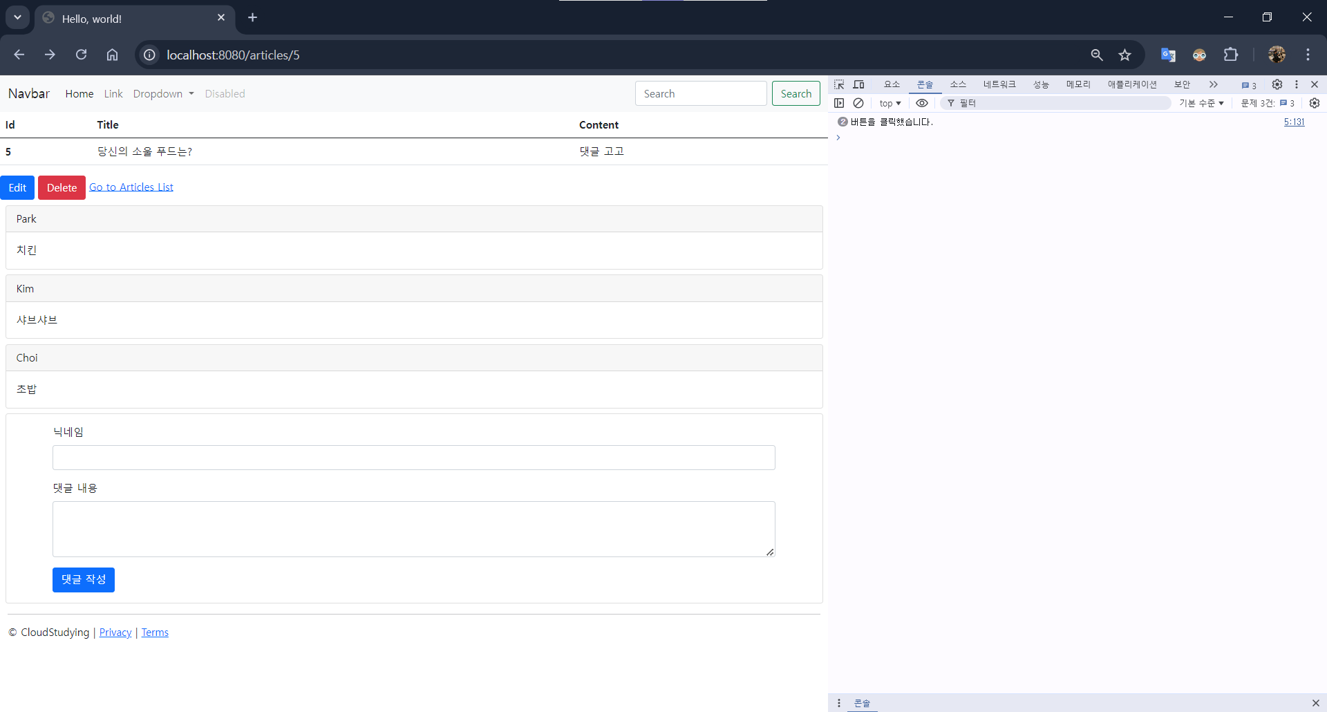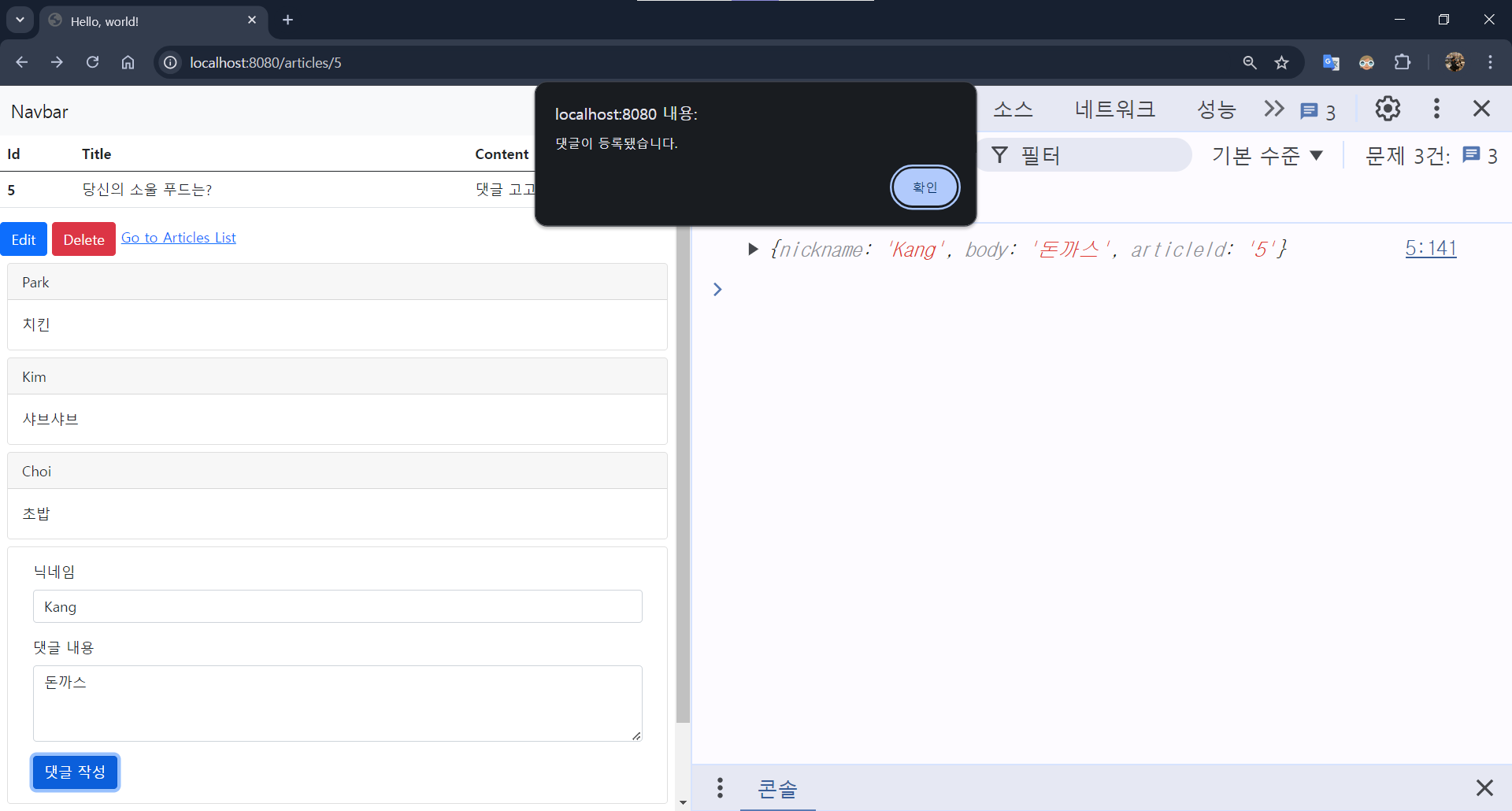 - [댓글 작성] 버튼을 클릭해 REST API 요청 보내기