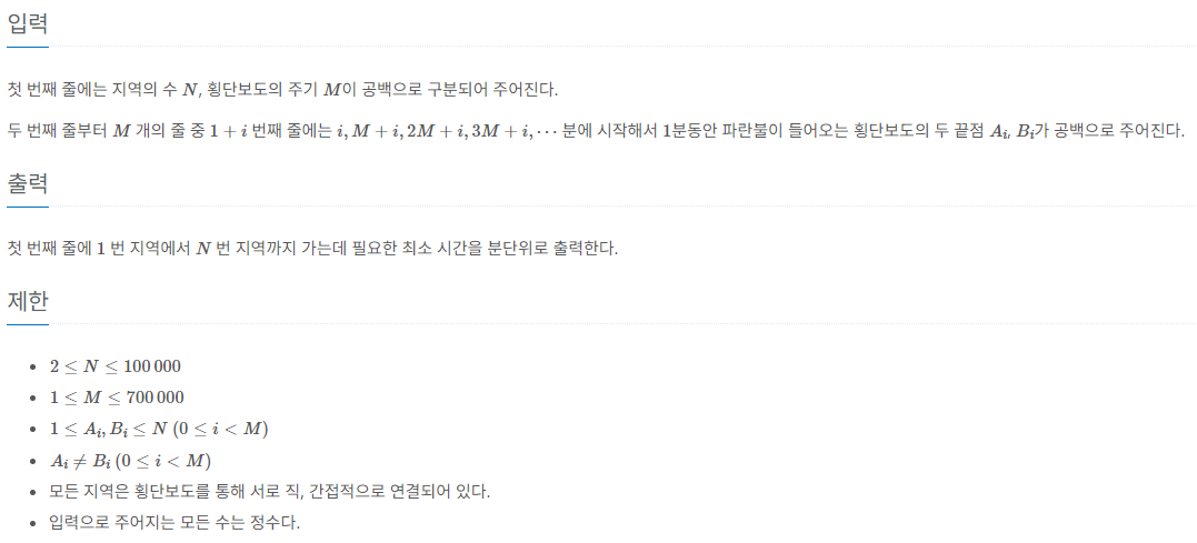 - ํ๋๋ถ์ด 1์ด ~ M์ด์ ์ผ์ง๋ค๊ณ ์ดํด์, N=2์ผ๋ ๋์ฐฉํ๋ฉด 1์ด๊ฐ ์๋๋ผ 2์ด๊ฐ ์๋๊ฐ? ์ถ์๋ค.