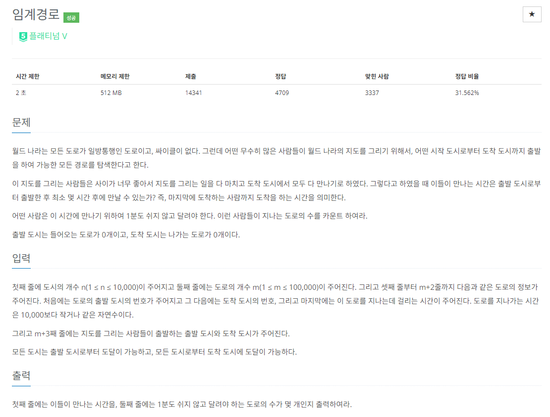 - ๋ง์ ๊ฒฝ๋ก ์ค์ ๊ฐ์ฅ ๋ฆ๊ฒ ๋์ฐฉํ๋ ๊ฒฝ๋ก์์ ์ง๋๋ ๋๋ก์ ์ ์ดํฉ์ ์ถ๋ ฅํ๋ค.