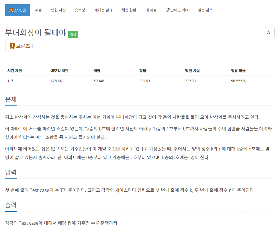 BOJ_2775 : ๋ถ๋ ํ์ฅ์ด ๋ ํ ์ผ ๋ณธ๋ฌธ
