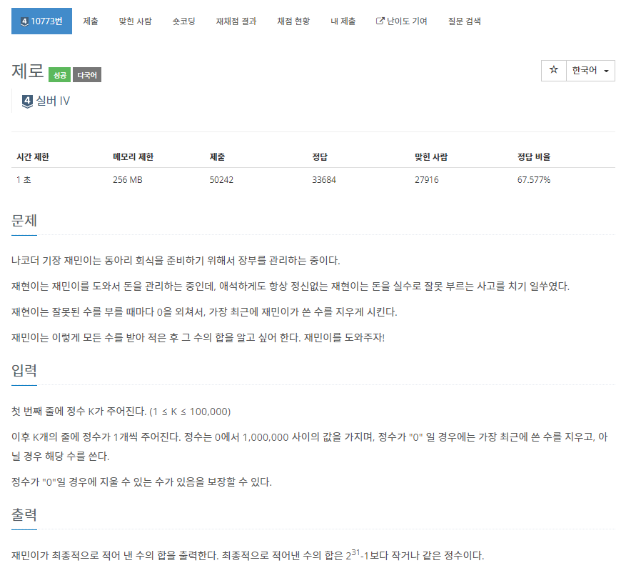 BOJ_10773 : ์ ๋ก ๋ณธ๋ฌธ