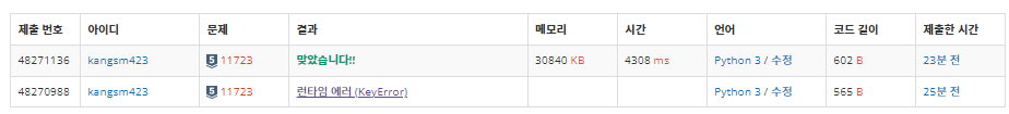 - KeyError๋ key๋ key-value ํํ ๋ฑ์์, ์๋ key๋ฅผ ํธ์ถํ์๋ ๋ฌ๋ค๊ณ ํ๋ค.